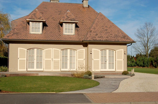 Les gouttières sont protégées par des montants en ferronnerie sur lesquels grimpent des rosiers.
