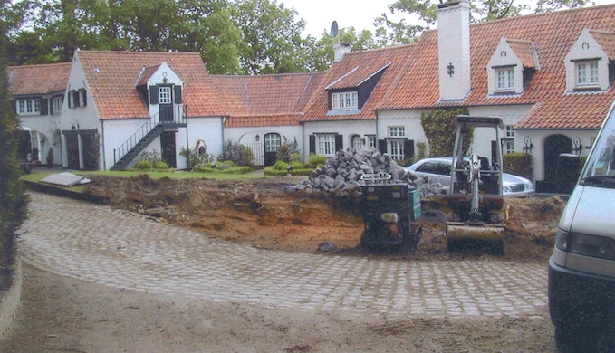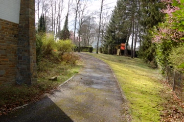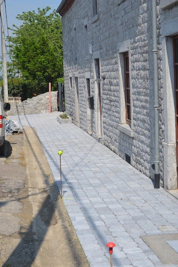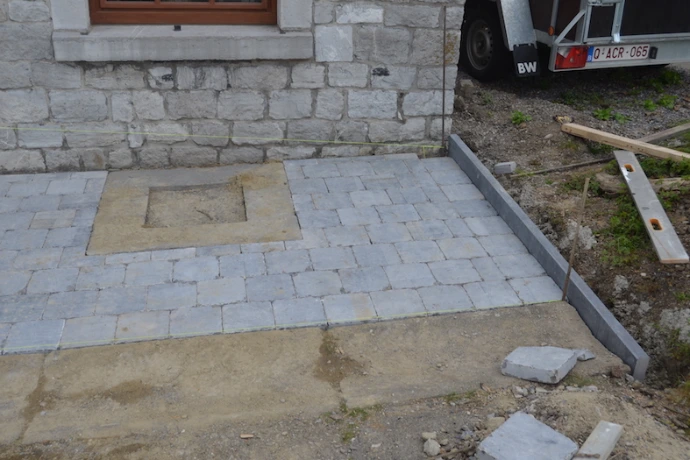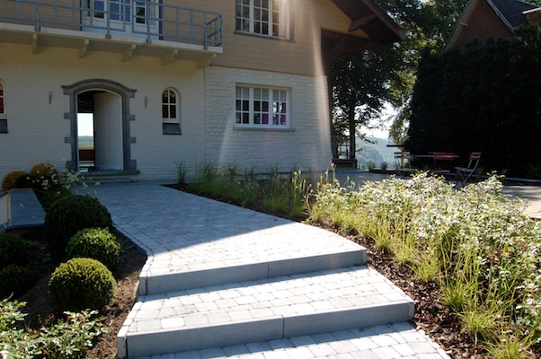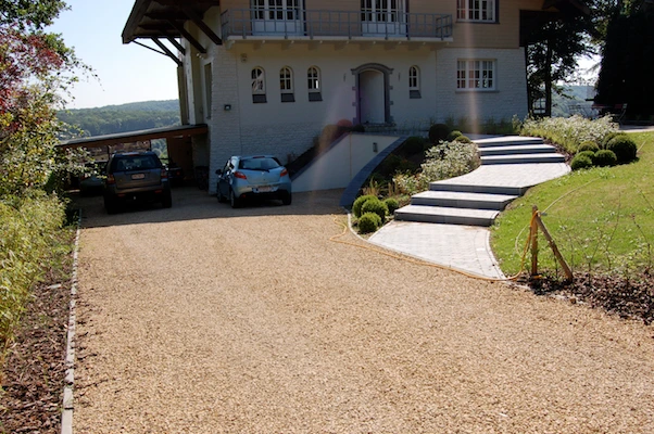 La drève est traitée en partie en pavés et en partie en dolomie damée pour alléger l’ensemble et diminuer les coûts.