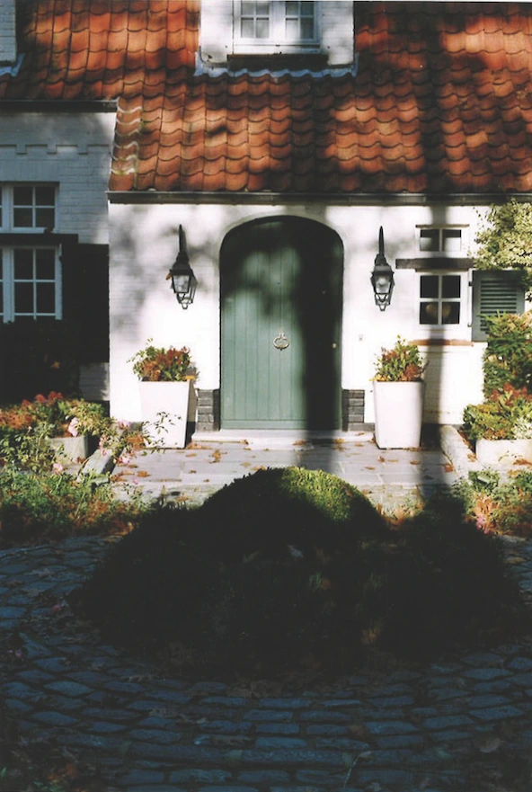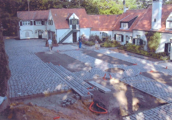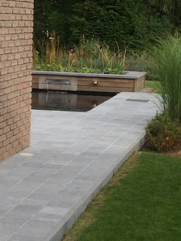 Des vasques en pierre bleue et sur mesure sont placées sous les lanternes existantes et marquent l’entrée.