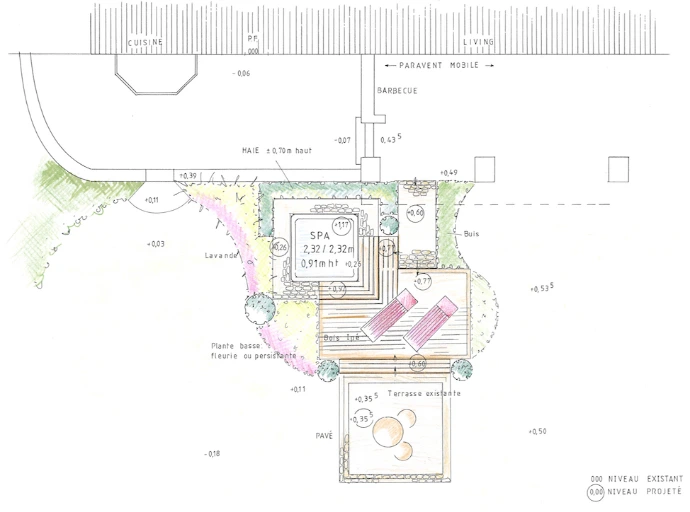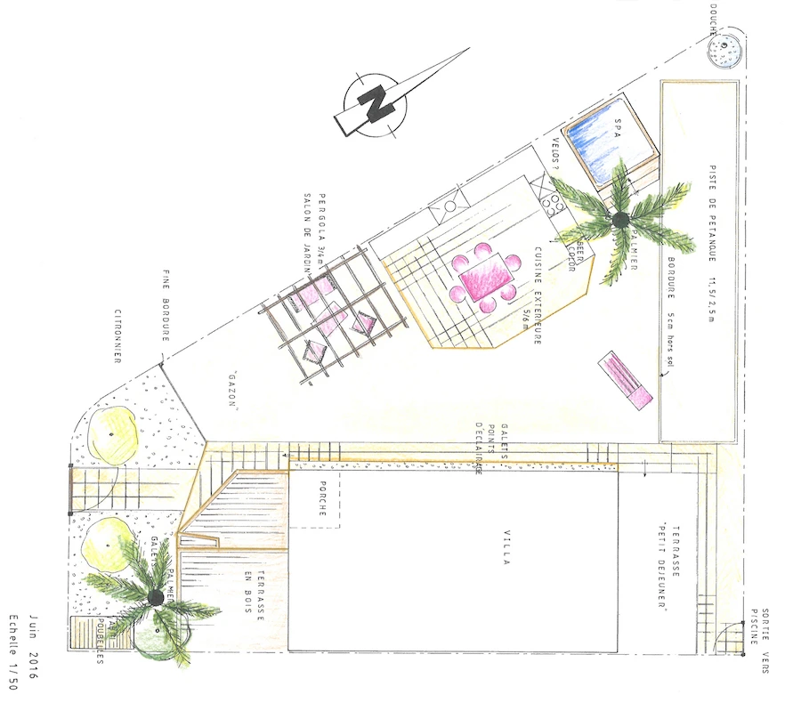 Vous me communiquez des photos, des mesures, un maximum d’informations concernant vos désidératas et les contraintes du pays, je peux tout à fait réaliser les plans d’aménagement de votre espace vert.