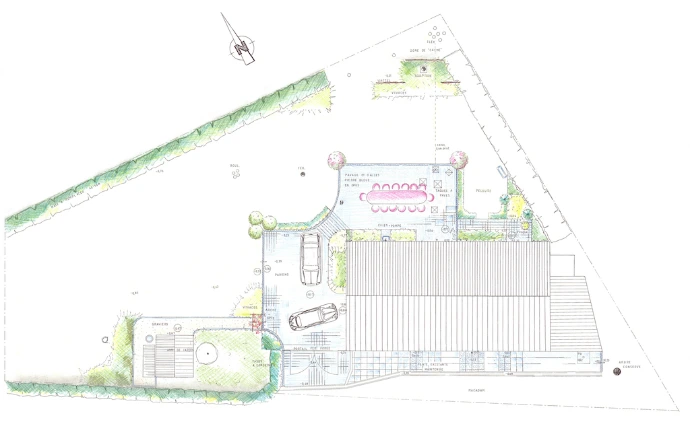 Des haies de différentes essences et de différentes hauteurs cachent sobrement les places de parking.